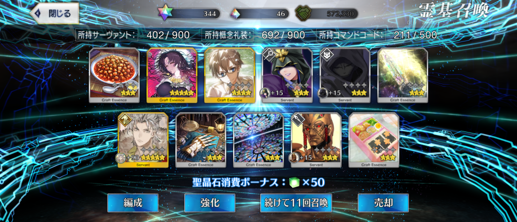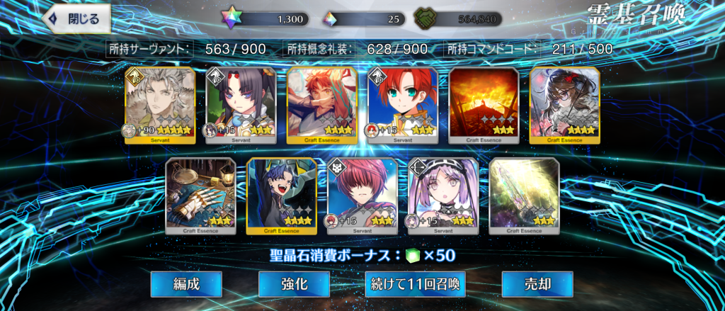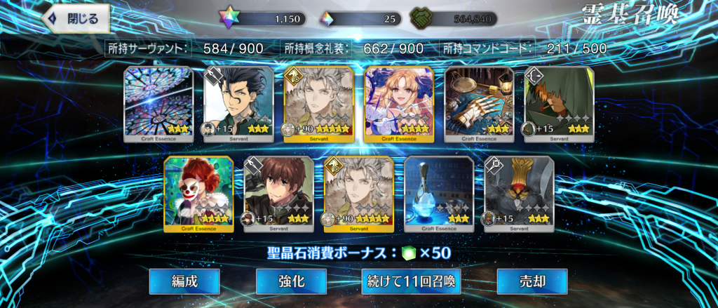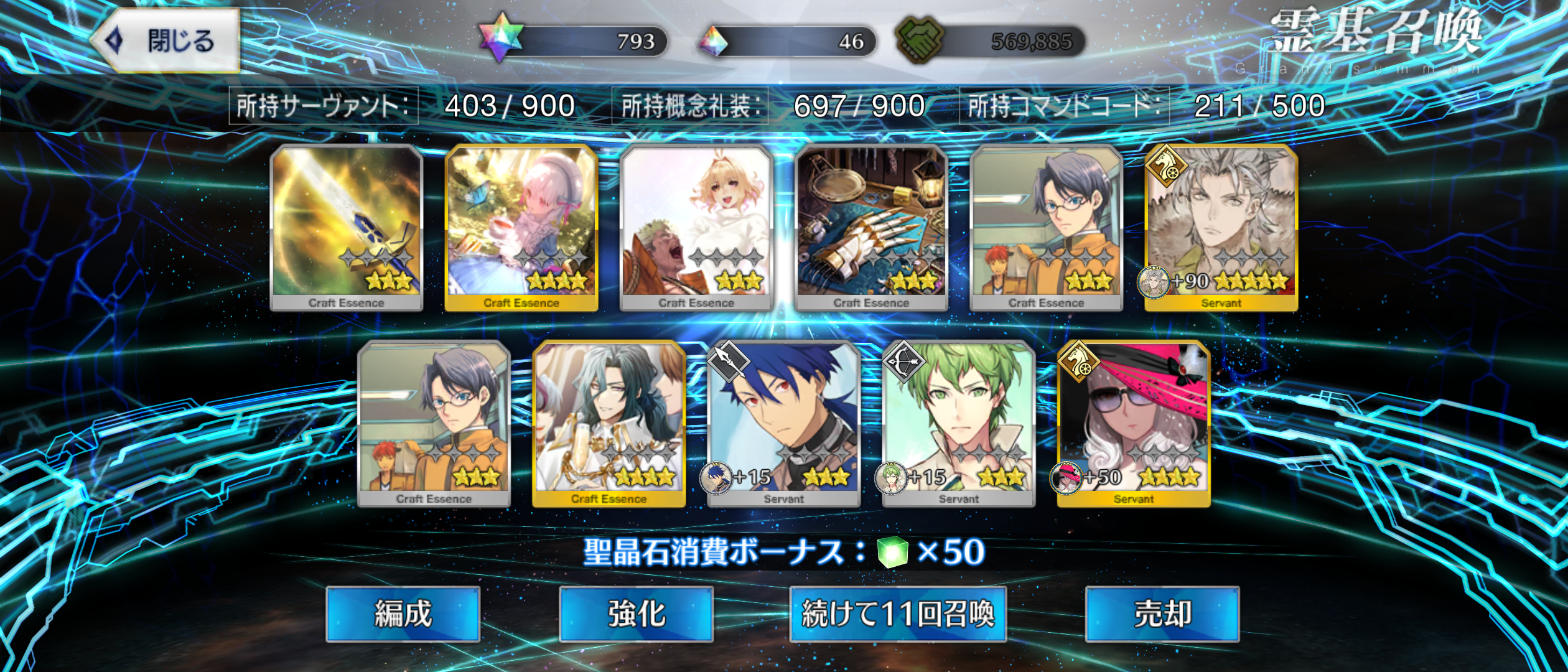 ↓PU越しの石は持たねえ…このあとはコール・ラヴァを凸する…!と息巻いてCBCのガチャに残りの石を全部ぶち込みました。交換した1枚も入れて4枚になったところで石残り16個…そして今日3/24の石10個プレゼントと片→石の交換を駆使してジャスト素寒貧になった瞬間のガチャ結果。これが5枚目の「コール・ラヴァ」 し…辛勝! 最終的にCBCの概念礼装全種凸できたという…すごいことになっちゃったな…