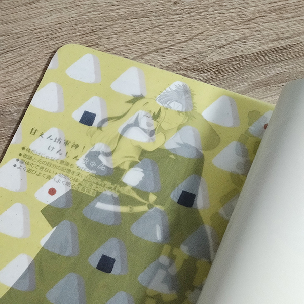 今回は作中ででてくるのでおむすび柄にしました。新潟は米が旨いし。ところであかつき印刷さんは今入稿特典でお米くれるらしいですよ。いいな…。いいもん…うちにはまだガタケットの帰りに駅のお店で買った米があるから…。