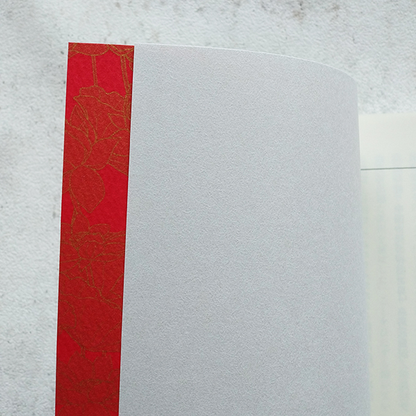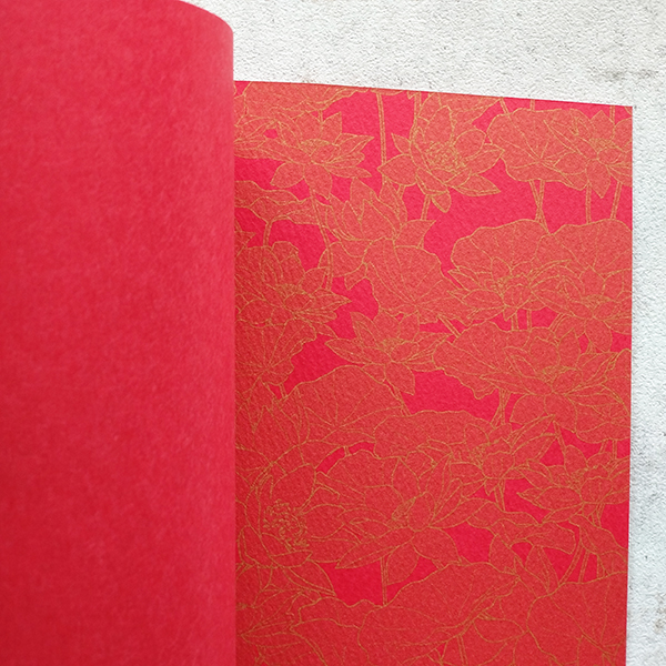 表紙は白い紙にCMYKで赤(Y100:M100)を刷ってもいいけれど、もとから色やエンボスが入った紙は印刷で出る色とはまた違う魅力があるなあと感じます。